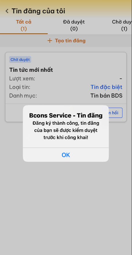 Sau khi bấm đăng ký > hiển thị 1 thông báo đăng ký thành công > Bấm " Ok". Tin đăng vừa đăng ký ở trạng thái " Chờ duyêt"